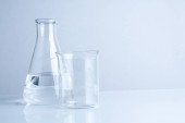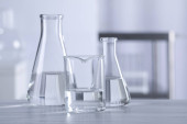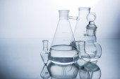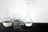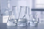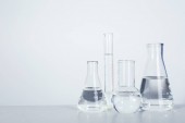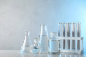 Naczynia laboratoryjne z płynem na stole na szarym tle. Analiza chemiczna