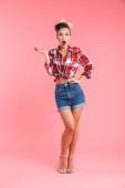 Obraz z niesamowite szczęśliwy młoda kobieta pin-up na białym tle nad różowy tło ściana patrząc aparatu.