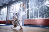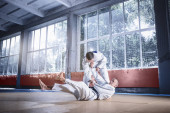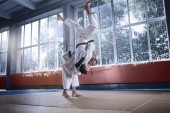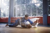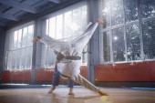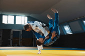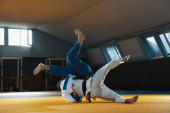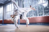 Dwóch zawodników judo Wyświetlono umiejętności techniczne podczas uprawiania sztuk walki w klubie walki