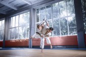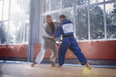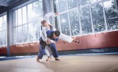 Dwóch zawodników judo Wyświetlono umiejętności techniczne podczas uprawiania sztuk walki w klubie walki