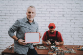 Pracownika, dając człowiekowi stały Laptop w warsztacie. Pracownik z narzędzia. Sprzętu komputerowego. Młodzi i starsi pracownicy. Nowoczesne urządzenia. Urządzeń cyfrowych. Drewniany stół. Koncepcja urządzeń elektronicznych.