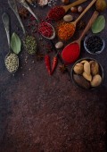 Różnych indyjskich przypraw w drewniane i łyżki i metalowe miski, nasion, ziół i orzechy na ciemny kamień tabeli. Kolorowe przyprawy, widok z góry, miejsca na tekst. Żywności ekologicznej, zdrowego stylu życia.
