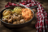 Szwedzkie klopsiki w sosie koperkowym podawane z ziemniakami i sałatka z marchewki.