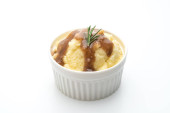 domowej roboty, tłuczone ziemniaki z sosem sos na białym tle