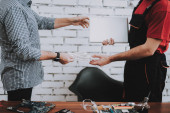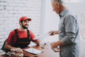 Zdjęcie "Dwa zakończony uśmiechający się mężczyźni w mundurach w warsztacie. Warsztat. Kciuk w górę. Sprzętu komputerowego. Młodzi i starsi pracownicy. Nowoczesne urządzenia. Urządzeń cyfrowych. Pracujesz w warsztacie. Koncepcja urządzeń elektronicznych." może być wykorzystywane do celów osobistych i komercyjnych zgodnie z warunkami zakupionej licencji Royalty-free. Obraz jest dostępny do pobrania w jakości wysokiej rozdzielczości do 5760x3840.