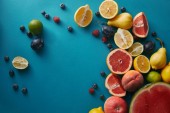 Widok z góry z dojrzałych owoców i jagód na powierzchni niebieski