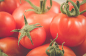 pomidory w koralowy kosz/pomidory w polu koralowy na ciemnym tle drewnianych, widok z góry i lato