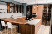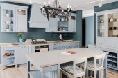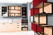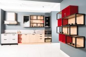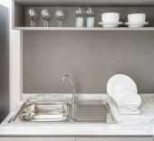 częścią czyste światło, nowoczesną kuchnią z zlew, kran i półki z płyty