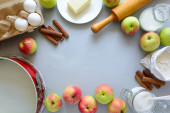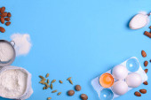 Pieczenia składniki ciasta domowe na niebieskim tle. Piec słodkie ciasto deser koncepcja. Widok z góry. Leżał z płaskim. Kopiować miejsca. Stonowanych