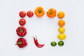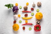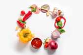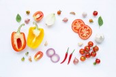 Widok z góry dojrzała papryka, pomidory i czosnek na białym tle