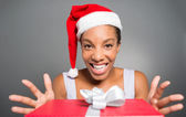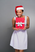Afro-młoda kobieta w suknię przytrzymanie pudełko z czerwoną wstążką i łuk na tle czarnego światła. Dziewczyna uśmiecha się, ona chętnie się obecny na Boże Narodzenie lub nowy rok