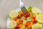 Zdjęcie "Drewniany stół na białym talerzu jest pokrojona w plastry ogórki, pomidory i liśćmi sałaty" może być wykorzystywane do celów osobistych i komercyjnych zgodnie z warunkami zakupionej licencji Royalty-free. Obraz jest dostępny do pobrania w jakości wysokiej rozdzielczości do 5760x3840.