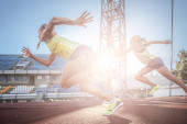 Dwóch zawodników lekkoatletka działa na bieżni wyścigu podczas treningu na stadionie w Lekkoatletyce.