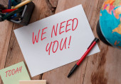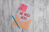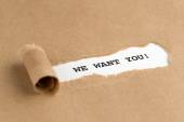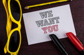 Uwaga: pisanie Wyświetlono możemy Want You. Biznes zdjęcie prezentujący firmę chce się zatrudnić wakat szuka talentów pracy zatrudnienia mężczyznę trzymającego znacznik notebook zmięty papier papiery kilku prób
