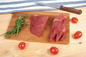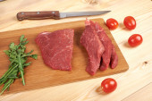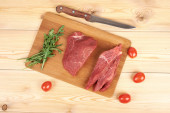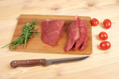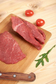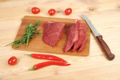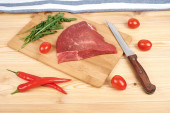 Plasterki surowej wołowiny na deska do krojenia i warzywa