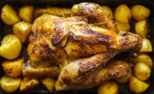 Całego kurczaka powoli gotowane w piecu z ziemniakami w zasobniku