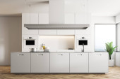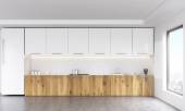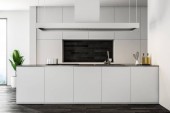 Biała ściana kuchni wyposażonej w ciemne, drewniane podłogi, szafy białe i blaty i wyspą z umywalką. makiety 3D renderowania