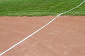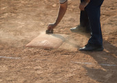 Sędzia czyści płyta główna w polu zakurzone baseball (softball), lato