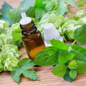 Medycyna naturalna - chmiel geen & brązowy butelka. Medycyna alternatywna, ciemnych butelkach & chmielu.