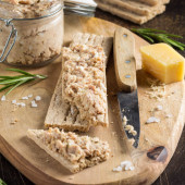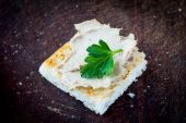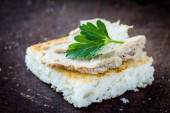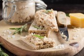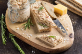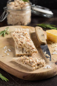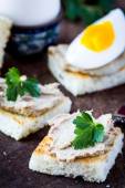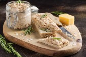 Pasztet z tuńczyka z jaj, ser w słoiku i chrupiącym pieczywem. Rillette ryb, zdrowe przekąski, dieta jedzenie