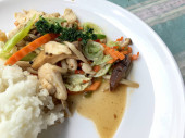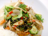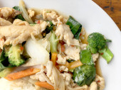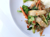 Stir fry żółty tofu i warzywa z ryżem i jajkiem w biały danie na białym tle dla świętowania festiwalu chińskiego nowego roku. Zdrowe jedzenie. Kuchnia tajska.
