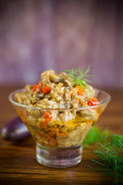 Sałatką z pieczonego bakłażana i papryki z pomidorki w naczyniu szklanym