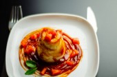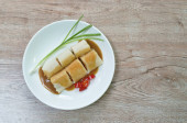 Cienkie naleśniki z dżemem w płycie na drewnianym stole