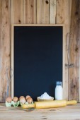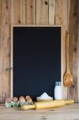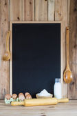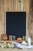 Drewniane tła z pusta tablica z miejscem na tekst i niektóre naczynia do gotowania