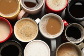 Szklanki świeżej kawy aromatyczne na podłoże drewniane, widok z góry. Fotografia jedzenia