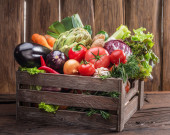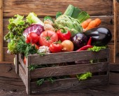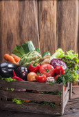 Świeże warzywa wielobarwne w drewnianej skrzyni. Podłoże drewniane.