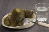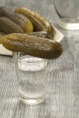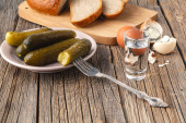 Rosyjska wódka w małych szklanych z czarnego chleba i ogórki ogórek