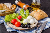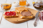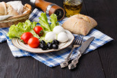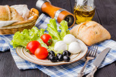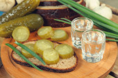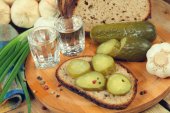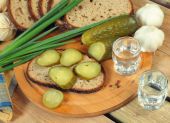 Marynowane ogórki, chleb żytni, cebuli i kieliszków wódki. Tradycyjny rosyjski przekąska na stole