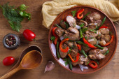 Zdjęcie "Smażone grzyby shiitake z zielonej cebuli na podłoże drewniane. Chińskie jedzenie. Widok z góry. Leżał z płaskim" może być wykorzystywane do celów osobistych i komercyjnych zgodnie z warunkami zakupionej licencji Royalty-free. Obraz jest dostępny do pobrania w jakości wysokiej rozdzielczości do 5760x3840.