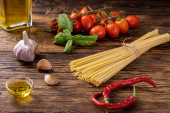 składniki do gotowania dla gotowania składa się z pomidorów, czosnku, soli, oliwkowy papryka i makaron na stół czarny