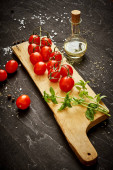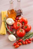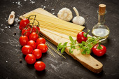 składniki do gotowania dla gotowania składa się z pomidorów, czosnku, soli, oliwkowy papryka i makaron na stół czarny