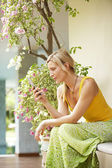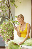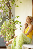 Młoda atrakcyjna kobieta ustanawiające na biały hamak w ogrodzie