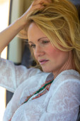 portret atrakcyjną kobietę noszenia tropikalny shirt pomarańczowy.