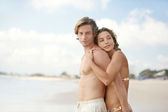 Młoda para całuje a ustanawiające nad złotym piaskiem na wakacje.