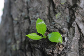 Młode zielone kiełki i pozostawia na szorstka kora starego drzewa