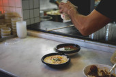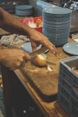 Męskie dłonie serwujemy potrawy na stół biały