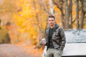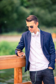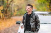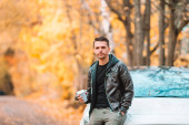 Portret młodzieńca jedzenie azjatyckiej ulicy żywności z kijami i fo bo zupa w kawiarni na świeżym powietrzu