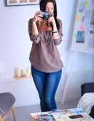Młoda kobieta ogląda materiał na filmie, stojąc przy oknie