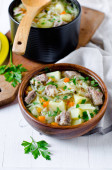 Zdjęcie "Meatball zupa z warzywami i makaronem nad podłoże drewniane z miejsca kopii. Domowej roboty zupy." może być wykorzystywane do celów osobistych i komercyjnych zgodnie z warunkami zakupionej licencji Royalty-free. Obraz jest dostępny do pobrania w jakości wysokiej rozdzielczości do 5760x3840.
