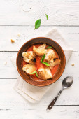Warzyw pomidorowa zupa gazpacho z krewetek (krewetki) i rozmaryn w miska na białym tle drewnianych, widok z góry, kopiować miejsca.