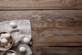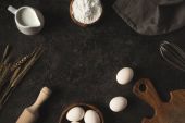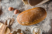 Widok góry niechlujny drewniany stół z rozlanym mąki i pieczenia składniki