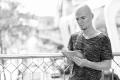 Mężczyzna na zewnątrz w nocy za pomocą cyfrowego tabletu