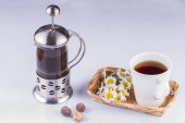 Gorąca zima linden herbaty w Francuska prasa pot, suchej herbaty ziołowe na tle drewnianych. kwiaty, liście, drewno i węgiel są wykorzystywane do celów leczniczych.