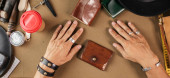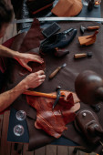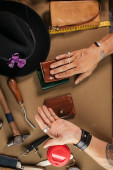 Zbliżenie rzemieślnika skórzanego pracującego z naturalną skórą przy użyciu narzędzi rzemiosła.