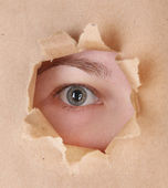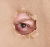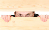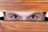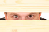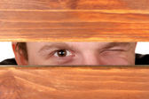 mężczyzna oczy patrząc przez otwór w drewniane biurko