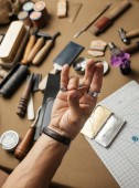 Zbliżenie. Mężczyzna ręka mistrz wyciąć nożem do produktów skóry. Małe przedsiębiorstwa